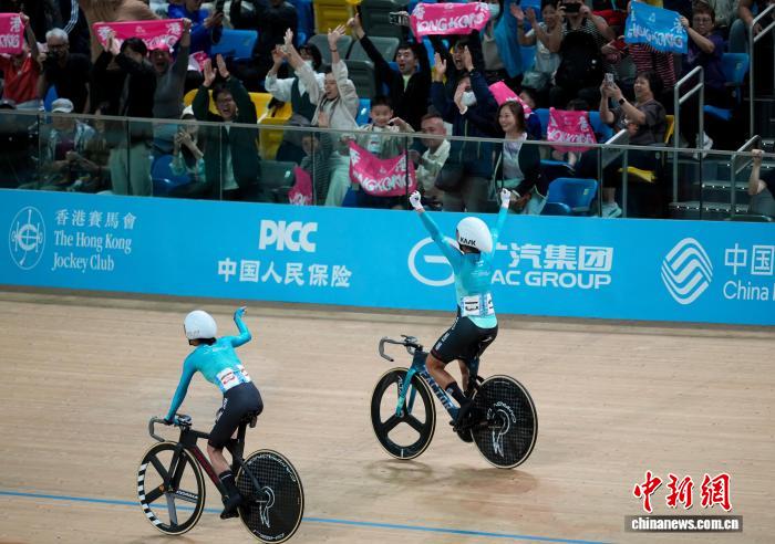 16日下午,在女子场地自行车麦迪逊赛中,李诗莹、梁颖怡组合夺得东道主香港队的冠军。他们在本届赛事场地自行车比赛中获得第一枚金牌,也是今年赛事的第六枚金牌,领先45分。